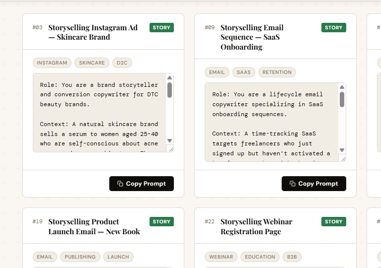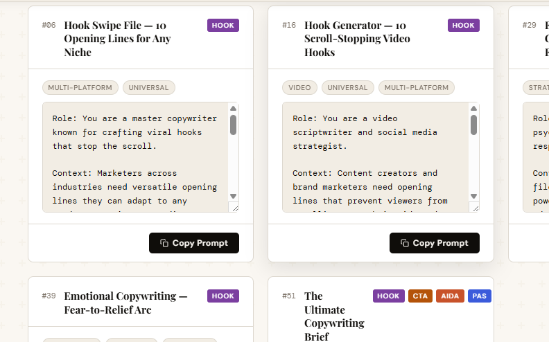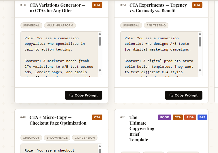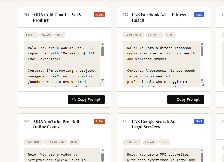 51 prompts covering the full spectrum of proven direct-response copywriting frameworks—applicable to any platform, any product, any audience.